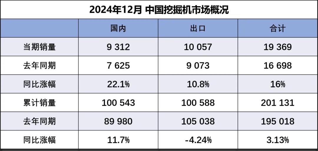 据中国工程机械工业协会对挖掘机主要制造企业统计,2024年12月销售各类挖掘机19369台,同比增长16%。其中国内销量9312台,同比增长22.1%;出口量10057台,同比增长10.8%。2024年,…...
