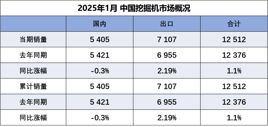 据中国工程机械工业协会对挖掘机主要制造企业统计,2025年1月销售各类挖掘机12512台,同比增长1.1%。其中国内销量5405台,同比下降0.3%;出口量7107台,同比增长2.19%。2025年1月…...